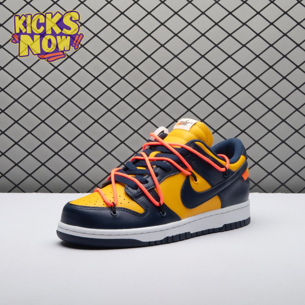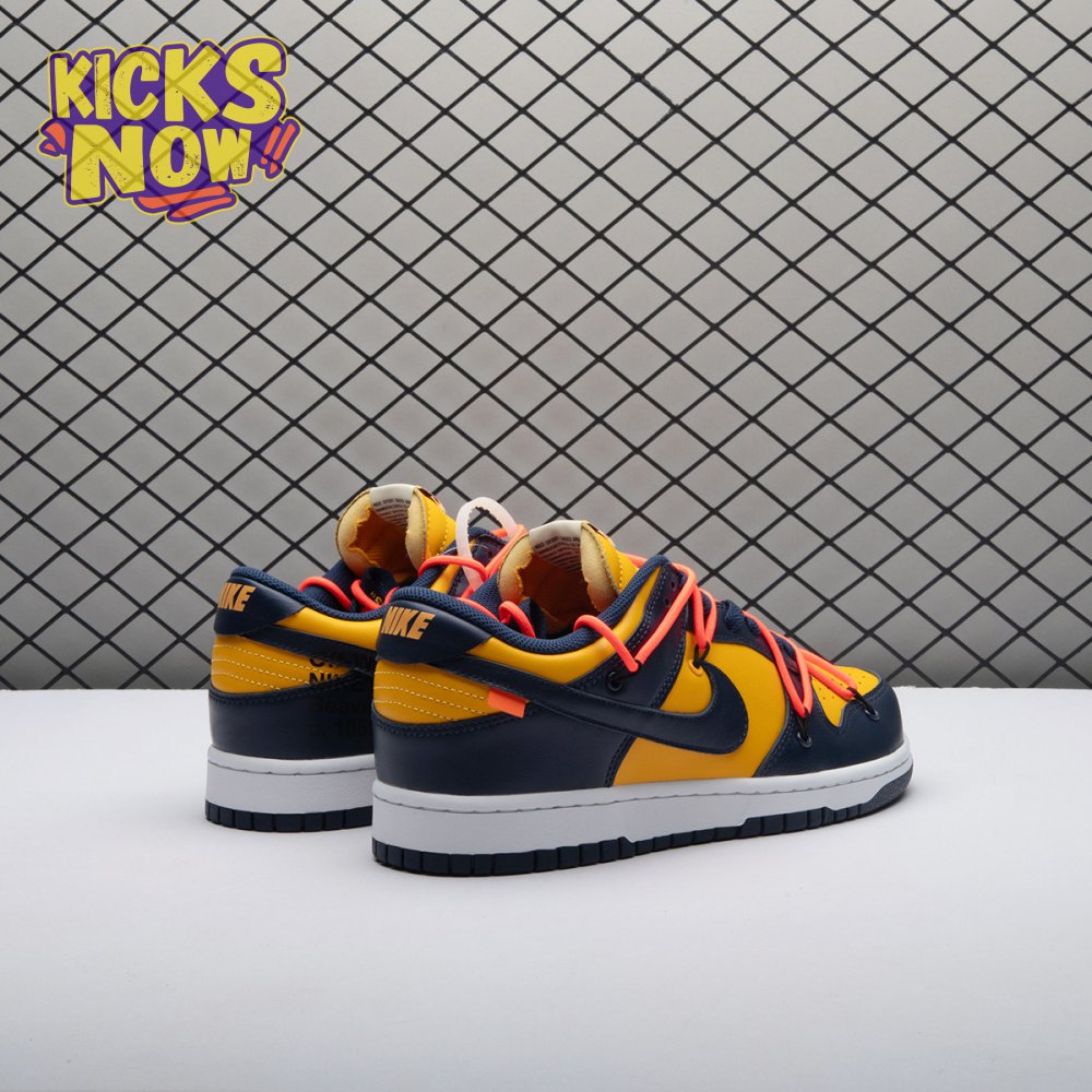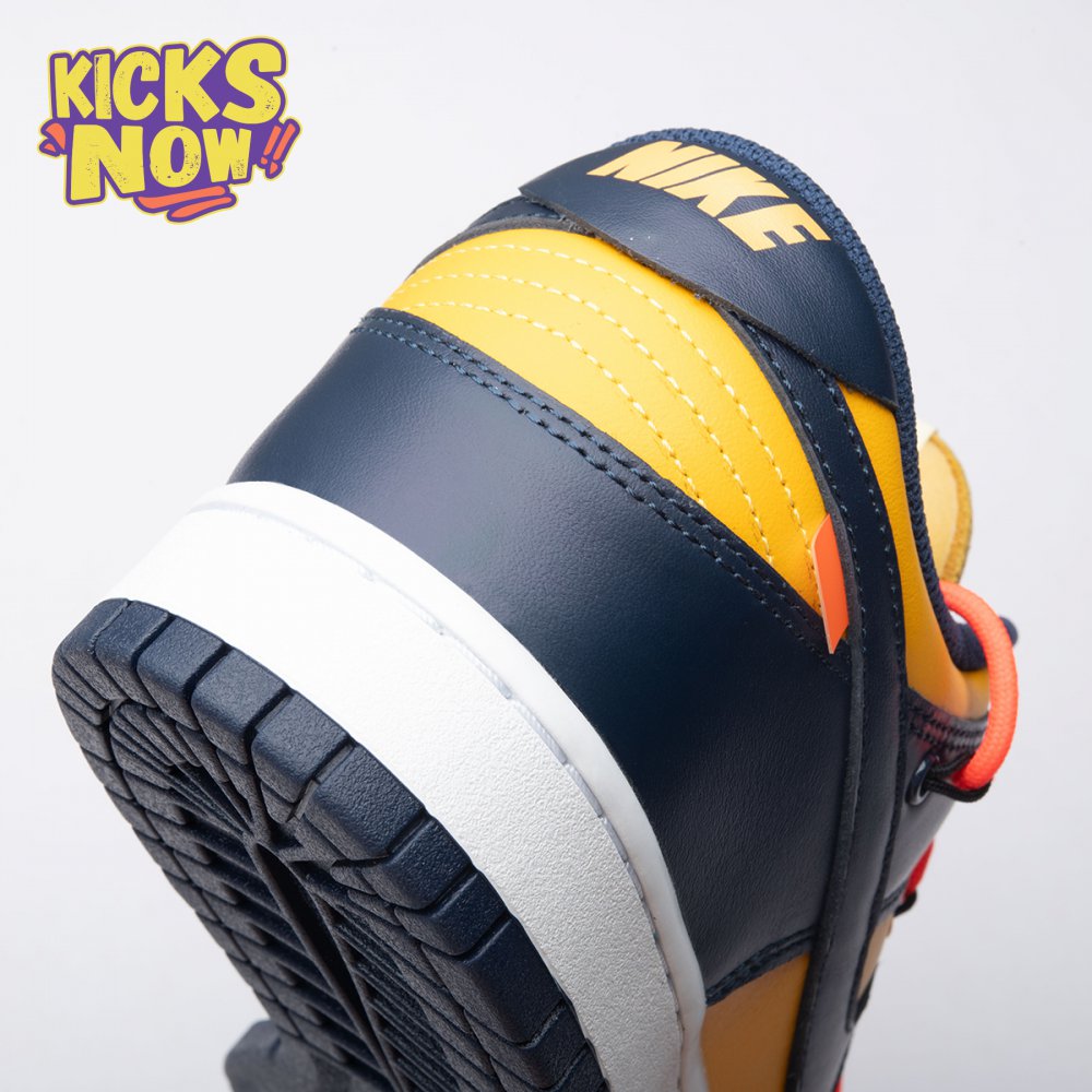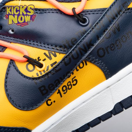 Arrived in December 2019, Off-White and Nike continue their creative partnership by revisiting the Dunk Low for a three-piece capsule. This edition in University Gold and navy leather sports a signature orange flag label on the lateral Swoosh. Virgil Abloh's deconstructed style is exhibited in the form of secondary Flywire lacing, exposed tongue foam and enlarged branding on the medial. The sneaker's split-colored rubber cupsole remains.