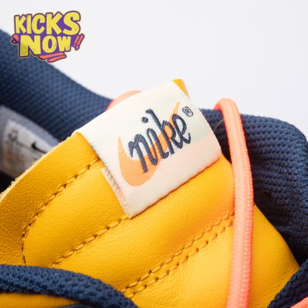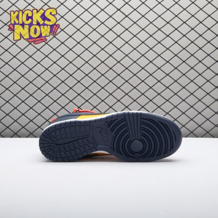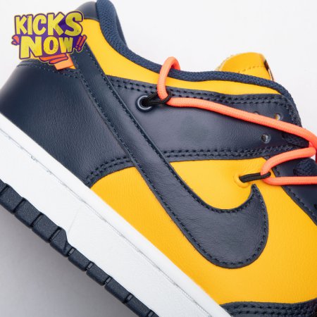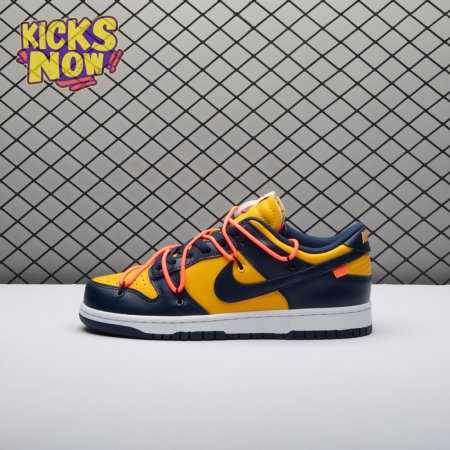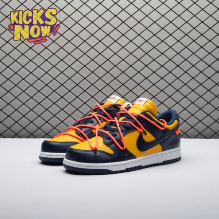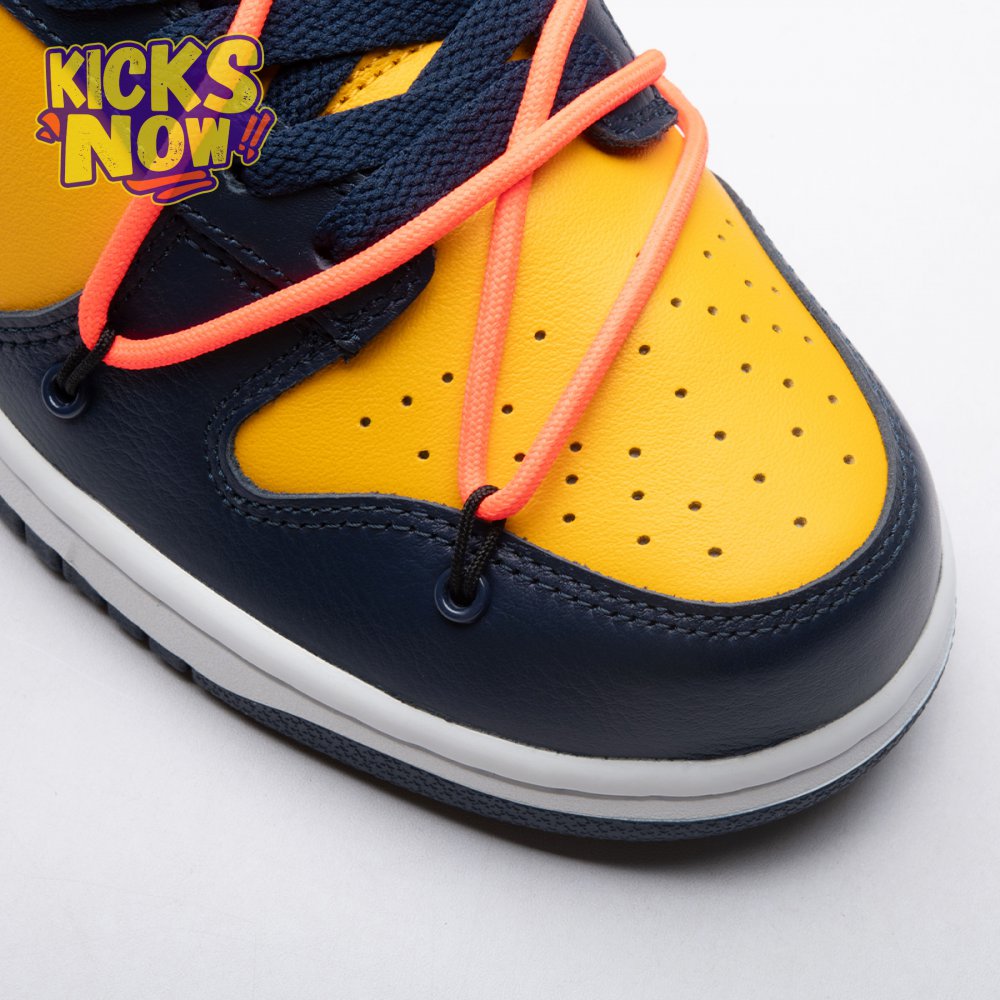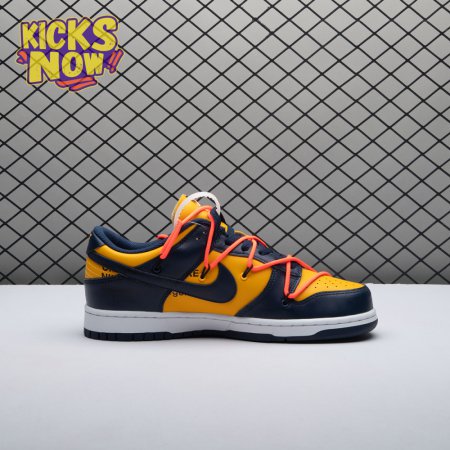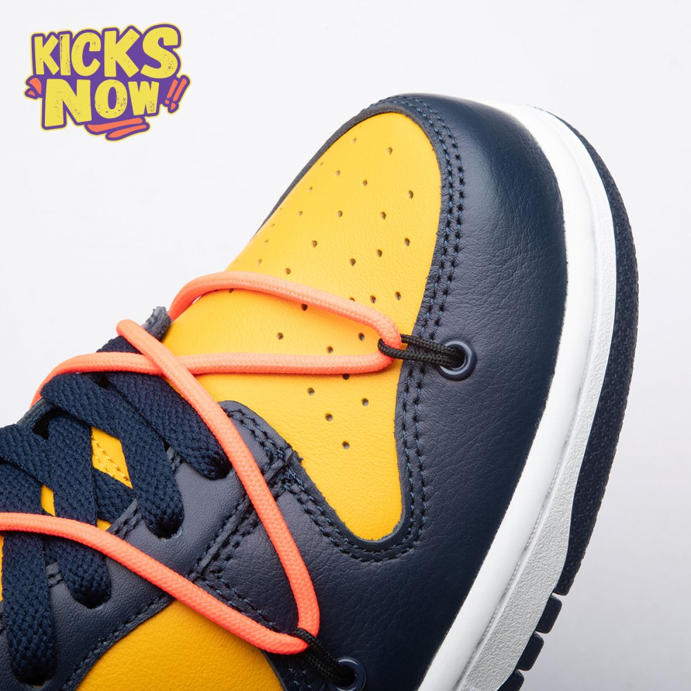 Arrived in December 2019, Off-White and Nike continue their creative partnership by revisiting the Dunk Low for a three-piece capsule. This edition in University Gold and navy leather sports a signature orange flag label on the lateral Swoosh. Virgil Abloh's deconstructed style is exhibited in the form of secondary Flywire lacing, exposed tongue foam and enlarged branding on the medial. The sneaker's split-colored rubber cupsole remains.
